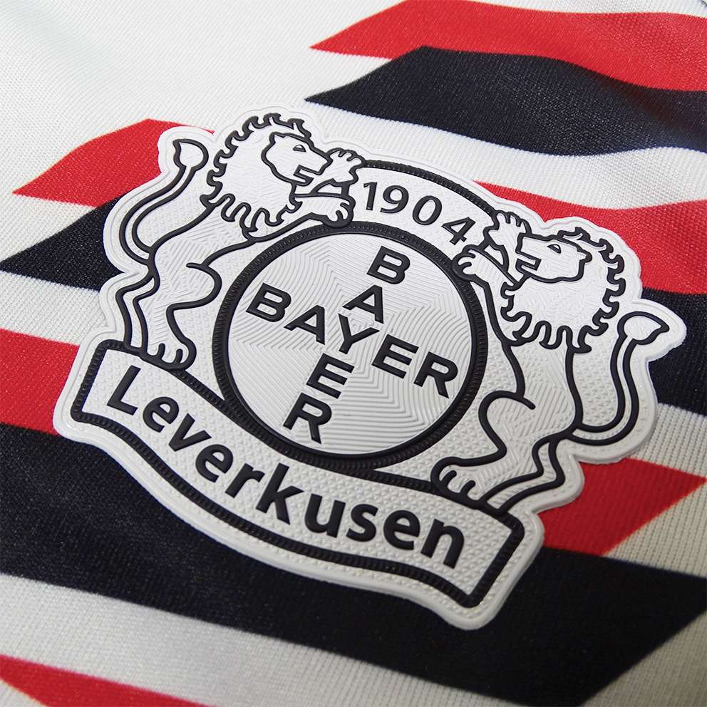 The new away jersey of Bayer 04 The grey Werkself away jersey is adorned with black and red stripes, which together form a horizontal stripe across the jersey from top to bottom. The jersey has a straight unisex cut, making it a must-have for your stadium visit. The Bayer 04 logo in a white and black 3D look on the left chest perfectly matches the jersey design, while the right chest features the black supplier logo of the British premium brand Castore. The neck is adorned with a black “Werkself” lettering. The main sponsor Barmenia is shown in black lettering on the chest.