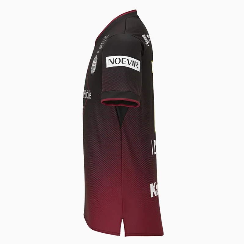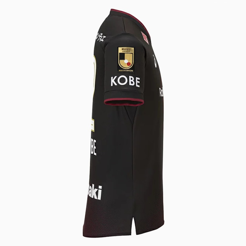 The Asics 2024 Vissel Kobe Mens Home Jersey has much more black than usual. It is mainly black, with red only used towards the bottom left for a gradient design, plus some detailing. On the right sleeve of the Asics Vissel Kobe 2024 home shirt is the 2023 J League champion badge.