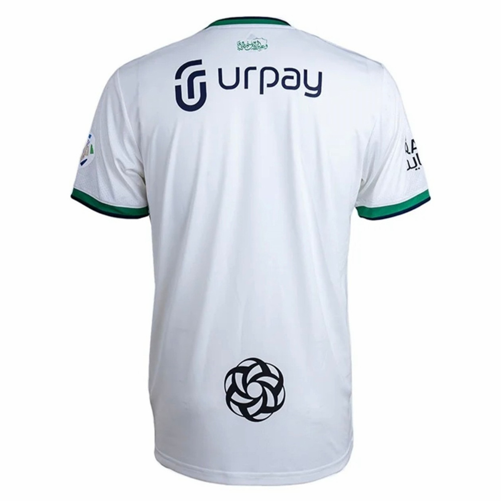 Created with Locker Room, the Adidas Al Ahli 2023-2024 home jersey has a green base with the old Tiro 19 graphic in dark green on the front. White is used for the Adidas branding, logos, collar and sleeve cuffs.