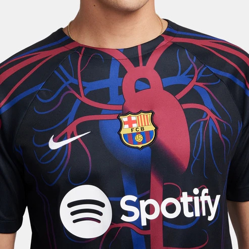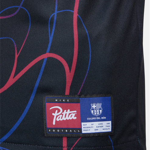 FC Barcelona x Patta pre-match shirt from the 23/24 season. Worn by the first team players to warm up before running out onto the pitch. Design showing the colours running through your blood, putting heart and crest front and centre. Shirt with FC Barcelona crest patch and embroidered Nike logo. Rounded neckline. Short sleeves. Nike Dri-FIT technology.