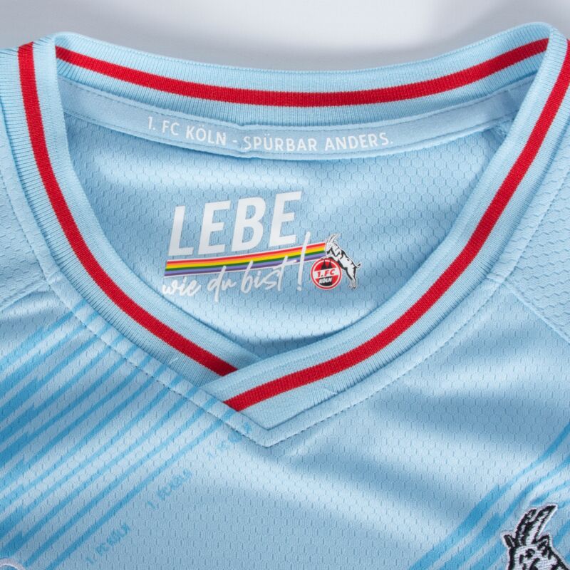 23-24 FC KÖLN Mens Third Jersey features a delicate blue base color with white logo details and red stripes on the collar and sleeve edges. The front of the jersey is designed with a diagonal graphic stripe pattern accompanied by the text “1. FC KÖLN” below it. The hummel logo and club logo badge are visible on the chest, while white hummel chevrons adorn the shoulders. In the neck mirror, a special logo with the text “LEBE wie du bist (live as you are)” is shown – a symbol of acceptance and equality, as well as a signal against discrimination and exclusion. The jersey is made of 100% recycled polyester.