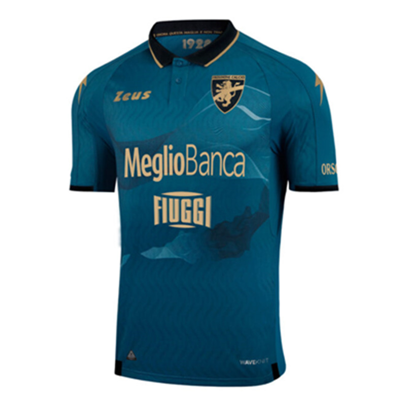 The Zeus 23-24 Frosinone Calcio Mens Fourth Jersey combines a dark green base with gold/black logos and applications. It is a fashionable colorway. Zeus use a classic Polo collar for the Frosinone Calcio 23-24 fourth jersey- The front has a one-of-a-kind subtle graphic design.