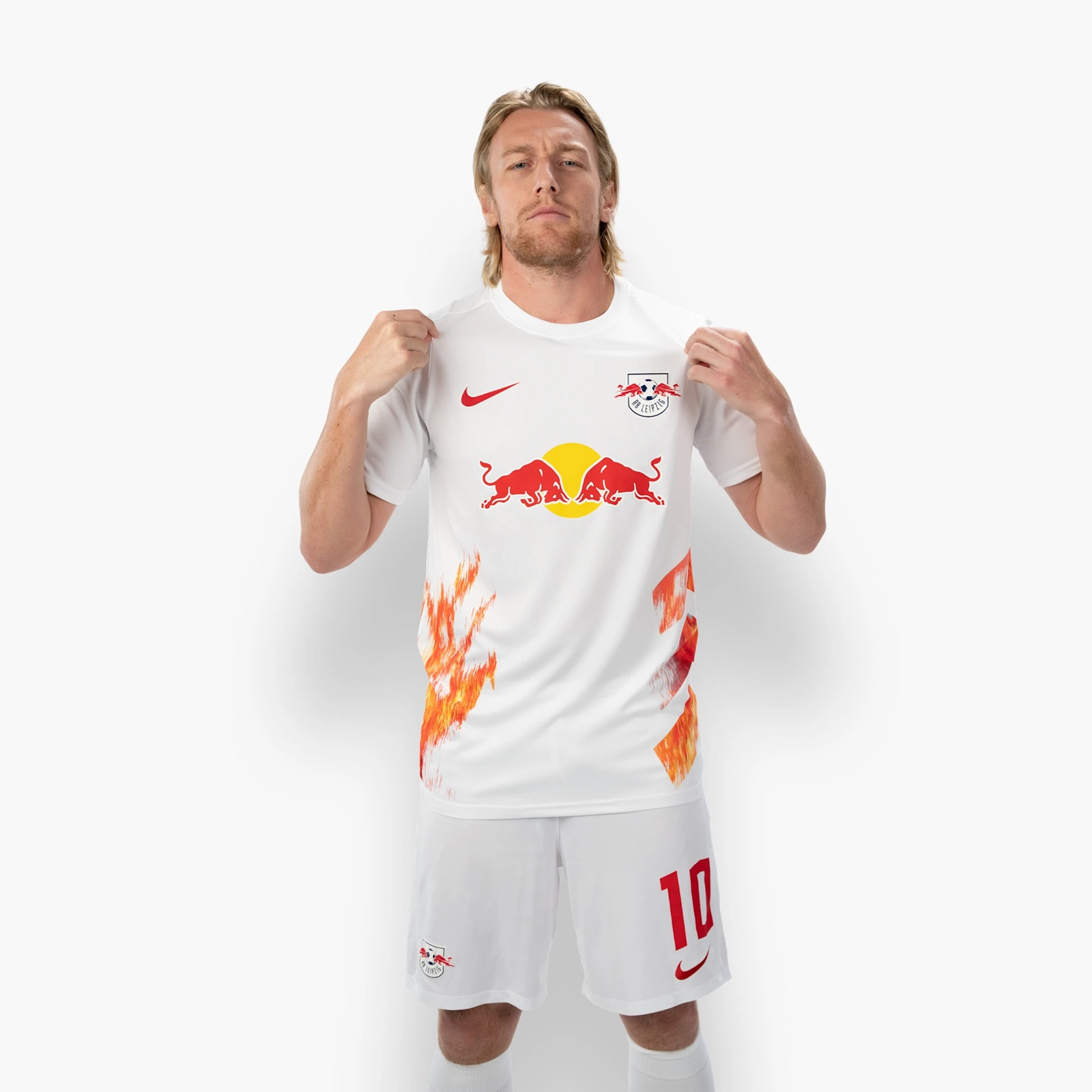 Leipzig on fire! A cup party hit by the Red Bulls turns into an outstanding fan chant. An outstanding fan song becomes a special jersey – our exclusive Nike special-edition jersey with a unique Leipzig-on-fire design. The colour scheme and design of our special jersey are clear – we are ON FIRE. The red and yellow flame element is reflected in all details of the white Nike jersey and is placed as a special highlight as lettering on the rear collar of the jersey.