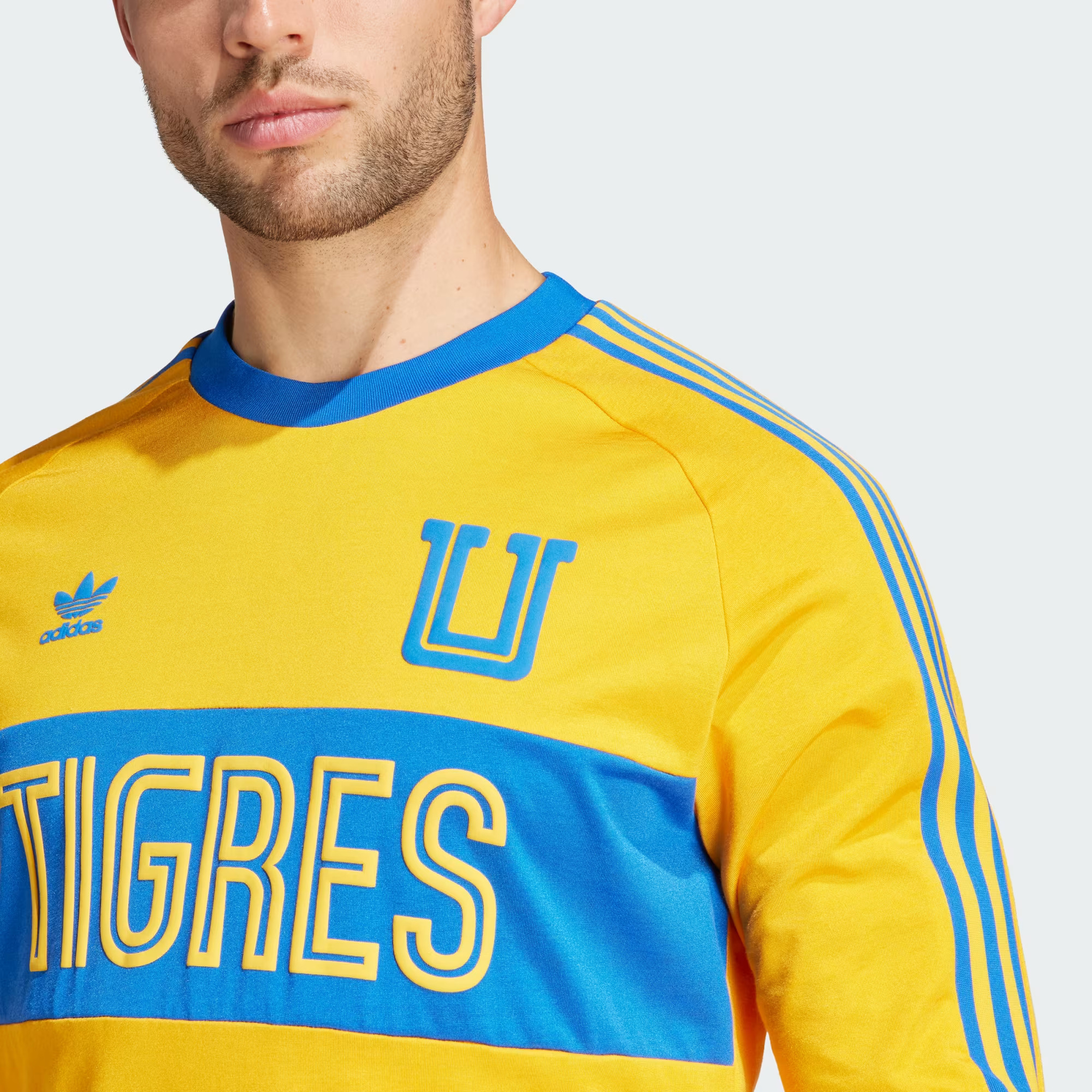 Rep your team in ’70s adidas style. This Tigres UANL jersey turns back the clock a half-century with classic soccer details, including a Trefoil and a chest bar complete with a raised team name that’s velvety soft to the touch. Screenprinted onto its premium single jersey fabric, a minimalist, era-appropriate team badge completes the vintage look. A minimum of 70% of this product is a blend of recycled and renewable materials.