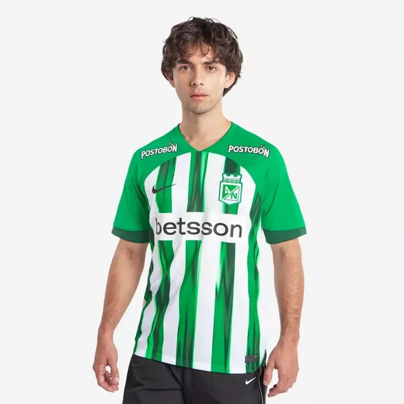 The Nike 24-25 Atletico Nacional Mens Home Jersey is a modern interpretation of the club’s classic stripes. The green stripes feature a graphic that “represents the street art of Medellín.”
