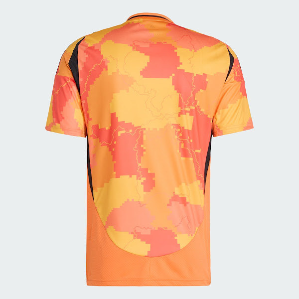 The Adidas Paris FC 24-25 third jersey grabs attention with its vibrant orange, yellow, and red digital camo pattern, inspired by the energy of the Parisian streets and music scene.