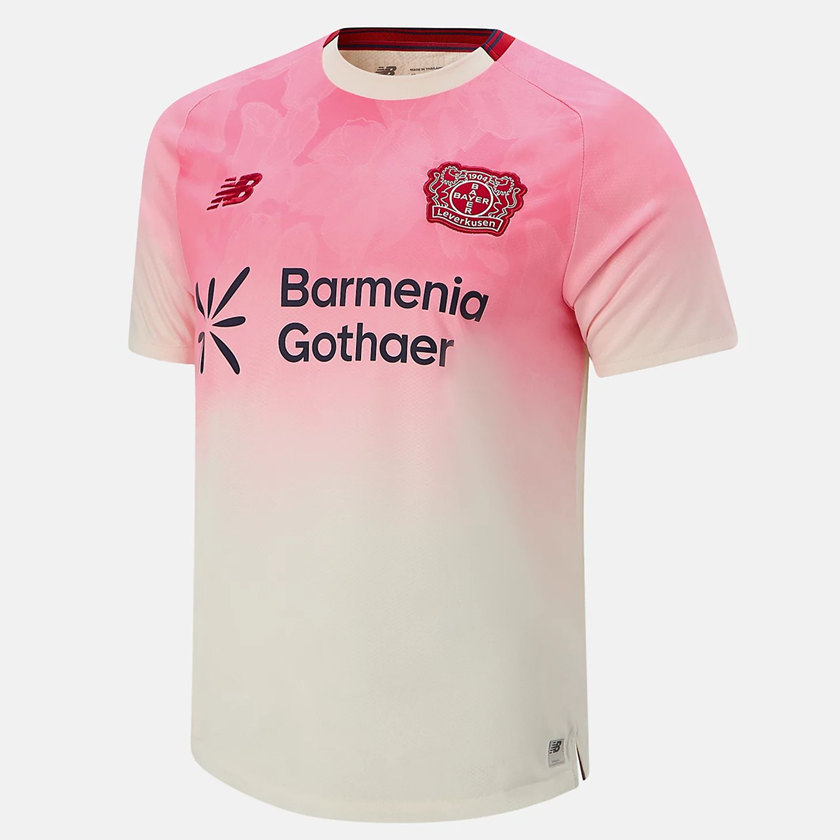 The New Balance Bayer 04 Leverkusen 2025-2026 away jersey for Bayer Leverkusen introduces a fresh and unexpected look. It has a soft white base that transitions into a light pink gradient towards the top, creating a soft, airy feel.