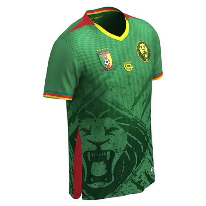 The Fourteen Cameroon 2025 home jersey is predominantly green, combined with red and yellow details – the colors of the Cameroonian flag. The standout detail of the shirt is a tonal lion graphic that appears both on the front and back. The inner neck of the kit has the Cameroon flag as well as the motto “Lions for Life”.